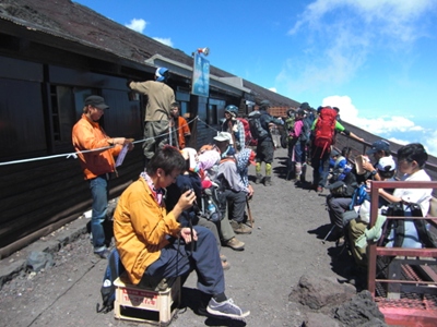 From the summit of Kengamine (剣ヶ峰), I caught without question one of the most spectacular sunsets I’ve ever seen in my life. As you can see below, the sun set behind a rather extraordinary looking cumulonimbus cloud, with a solid layer of billowy, cumulus clouds below, similar to the view one often sees from the window of a jumbo jet. ![]() Sunset from Mt. Fuji's Kengamine peak At the summit of Kengamine (剣ヶ峰), I found not only a small obelisk marking the highest point in Japan, but also the Mt. Fuji automated weather station (富士山特別地域気象観測所), which was a manned operation for 72 years until September 2004, when it was replaced with a fully automated system. Oops....Crash Landing - Another interesting, but disappointing, thing happened to me atop Kengamine (剣ヶ峰). After a nice Japanese guy took my picture with my camera while I was standing next to the obelisk marking Japan’s high point, I tripped and fell getting down, breaking my digital camera. ![]() Consequently, the rest of the pics and video clips I made on this trip, including the beautiful sunset from Kengamine (剣ヶ峰) and the next morning’s sunrise, were taken with my cell phone. After the beautiful sunset from atop Kengamine (剣ヶ峰) which occurred around 6:30 pm, I needed to get back to the Chojo Fujikan summit mountain hut (頂上富士館) because lights out was at 7:00. ![]() Fuji-san Kengamine sunset with 3-day-old crescent moon Day 2 – August 22, 2012Well, it was rise and shine bright and early at the Chojo Fujikan summit mountain hut (頂上富士館) with lights on at 4:00 am. Of course, SOME eager beavers were already stirring before 3 am. UGH!! Japanese mountain huts are always a tremendous convenience, as they keep you from having to lug in a tent, sleeping bag, cook stove, or a bunch of food, but you can pretty much kiss getting a good night’s sleep goodbye. With all the people snoring, getting up in the middle of the night to go to the toilet, and even talking, earplugs are definitely recommended. And it certainly doesn’t help matters that during peak season, climbers get packed in like sardines, so much so in fact that each person gets less than the width of a normal-size sleeping bag. The Headache from Hell - If all of that wasn’t enough to deal with by itself, I had a head-splitting headache ALL night long. And I was too polite (read: stupid) to get up and track down my aspirin, because I realized it was in the bottom of my pack, which was high up on a shelf, and didn’t want to disturb those who were already sleeping. Big mistake. Not always being the sharpest tool in the shed, I didn’t realize until the next morning that I was in fact for the first time in my life and after nearly a half-century of alpine hiking, suffering from altitude sickness. ![]() Duh! In fact when I finally got up, I felt so nauseous that I couldn’t eat my gorgeous rice, seaweed, and furikake (ground seafood flakes, 振り掛け) breakfast prepared by the Chojo Fujikan summit mountain hut (頂上富士館). Instead, I decided to enjoy it later at the 9th station (富士宮九合目) on the way back down. Japanese Sunrise Culture - Well, I must say that viewing the magnificent sunrise (goraiko, 御来光) was a true cultural phenomenon. Just outside of the Chojo Fujikan summit mountain hut (頂上富士館) is a small peak called Komagatake (elev. 3718m), and starting at least 30 min. before sunrise which occurred just after 5 am, climbers with their headlamps started gathering on and around this peak to stake out their spot to view the upcoming sunrise. In those same 30 min. just before sunrise, I would guesstimate that at least five or six tour groups arrived in the summit area from both the Fujinomiya Trail (富士宮登山道) and the Gotemba Trail, which intersects the Ohachimeguri summit loop trail (御鉢めぐり) just immediately to the east from here. By the time 5 am finally rolled around, there were at least 200 people who had gathered to cheer, ooh and aah, and even applaud one of the most breathtaking sunrises I think I’ve ever seen. ![]() Fuji-san sunrise (goraiko, 御来光) at 5:03 am on Aug. 22, 2012 It almost felt religious. Well, why not? After all, Mt. Fuji is not only Japan's highest mountain, but along with Mt. Tateyama and Mt. Hakusan, it is one of Japan's "Three Holy Mountains" (三霊山, Sanreizan). You can catch a small