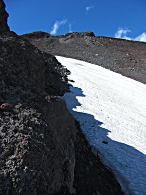 Fuji. Day 1 – August 21, 2012Having spent the night before in a Toyoko Inn near Numazu Station, I started off my Mt. Fuji journey bright and early by catching the 7:30 am Fujikyu bus at Fujinomiya Station, bound for the Fujinomiya 5th Station. After arriving at the Fujinomiya 5th Station (富士宮口五合目) just before 9 am, I milled around a bit to do a little window shopping in the souvenir shop and picked up a free map before hitting the trail at 9:20. There was a very nice gentleman at the trailhead named Nakashima-san who spoke a little English and who gave me another small trail map in English. Well, I couldn't have asked for a nicer day, with the clear blue sky and an absolutely breathtaking view of Suruga Bay all the way up the mountain. On the way up, I met lots of nice folks, and only occasionally did I pass another foreigner. After climbing about an hour or so, I started hearing what sounded like thunder down below, but some other Japanese hikers assured me that it was just live fire drills being conducted by the self-defense forces at Camp Fuji. One of the most interesting things I saw on the way up was the VERY long snowfield known as Mannenyuki (萬年雪), Japanese for "10,000 year snow," which I'm guessing must be at least 200m in length. ![]() Mannenyuki snowfield (萬年雪, 10,000 yr. snow) Alpine Greenery - Another pleasant surprise was to see all the bright green alpine plants above the timberline. One of the most prominent plants that I noticed, especially from the New 7th to the 8th Stations, was the Artemisia Pedunculosa, known in Japanese as Miyamaotokoyomogi (深山男蓬, ミヤマオトコヨモギ), which translates as “deep mountain male sagebrush.” One of my Tokyo friends, who always disparagingly refers to Mt. Fuji as just a pile of cinder and ash, will be very surprised to see my pic of this beautiful green plant in the Flickr album linked below. I was also puzzled by a number of signs at the mountain huts, referring to the Fujinomiya Route as "Omoteguchi." As it turns out, since ancient times, the Fujinomiya Route (富士宮ルート) has been referred to as the "front entrance (表口)" to Mt. Fuji due in part to the way it has been depicted historically in countless poems and literature, as well as artwork such as Katsushika Hokusai's (葛飾 北斎) woodblock print series "Thirty-six Views of Mount Fuji (富嶽三十六景)." I arrived at the Chojo Fujikan summit mountain hut (頂上富士館), my sleeping spot for the night, around 4:15 pm. Before my gorgeous curry rice dinner which was served at 5:00, I had a little time to walk around and check out the Sengentaisha-Okumiya shrine (浅間大社奥宮), the adjoining Fujisan-cho summit post office (富士山頂郵便局), the highest post office in Japan, and the inside of Mt. Fuji’s mountaintop crater (富士山山頂噴火口). ![]() Mt. Fuji summit crater (富士山山頂噴火口) Kengamine (剣ヶ峰), Japan's actual high point - After dinner, I took the 20 min. stroll westward along the Ohachimeguri summit crater loop trail up to the top of Kengamine (剣ヶ峰), elevation 3776m, the highest of Fuji-san’s 8 summit peaks, and the highest point in Japan (日本最高峰). "Ohachimeguri (お鉢めぐり, お鉢巡り)," means in Japanese "to go around the bowl." Click thumbnail below to view detailed trail map for Mt. Fuji's Ohachimeguri: