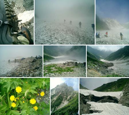 Despite being a relatively easy climb, Mt. Shirouma-dake (白馬岳) (Japanese for "White Horse Mountain") is without question one of Japan's most dangerous peaks, claiming lives just about every year. In fact, on Aug. 27, 2006, the very next day after I hiked up the Daisekkei Valley (大雪渓) (big snow valley), a lady died there after being struck by a huge, 1-meter wide boulder that tumbled down out of nowhere in foggy conditions with severely restricted visibility. After the massive 8000 cu. m. landslide(*) of Aug. 11, 2005 killed one hiker and injured 2 others in the Daisekkei Valley, a team of Japanese researchers identified a number of unique factors, the combination of which make the valley especially hazardous: